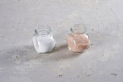 2 glass jars one is full of fine himalayan salt and the other with table salt on white background