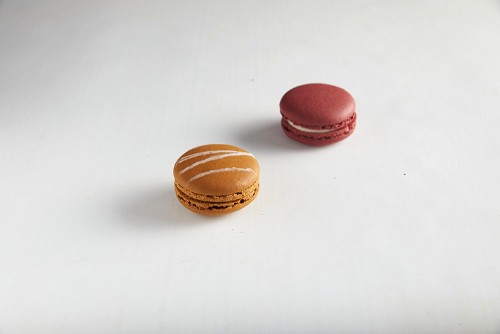 45º Shot of of two assorted Brown Irish Cream, and Red Velvet macarons on white background