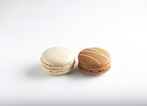 45º Shot of of two assorted Brown Irish Cream, and White Caramel fleur de sel macarons on white background