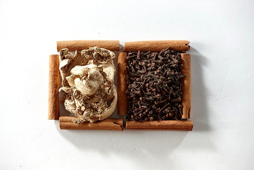 2 squares of cinnamon sticks full of cloves and dried ginger on white flooring