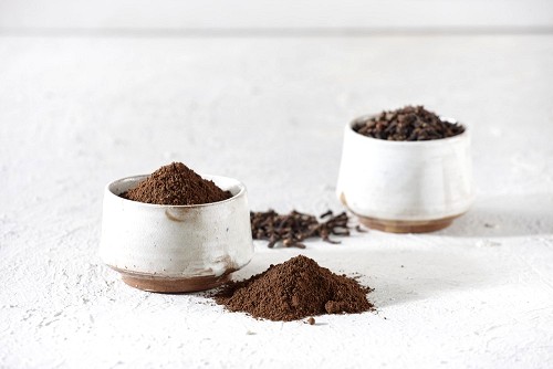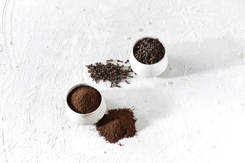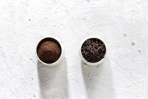2 Beige ceramic bowls, one full of cloves and the other full of powder on textured white flooring