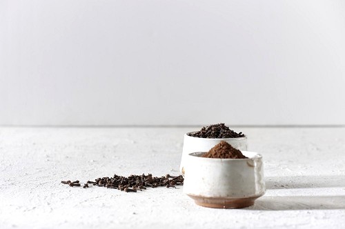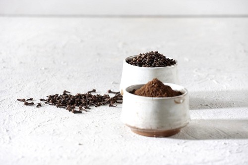 2 Beige ceramic bowls, one full of cloves and the other full of powder on textured white flooring