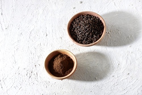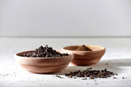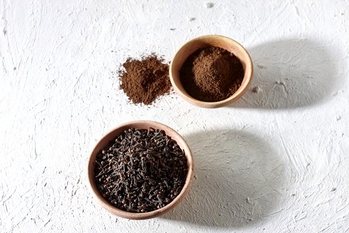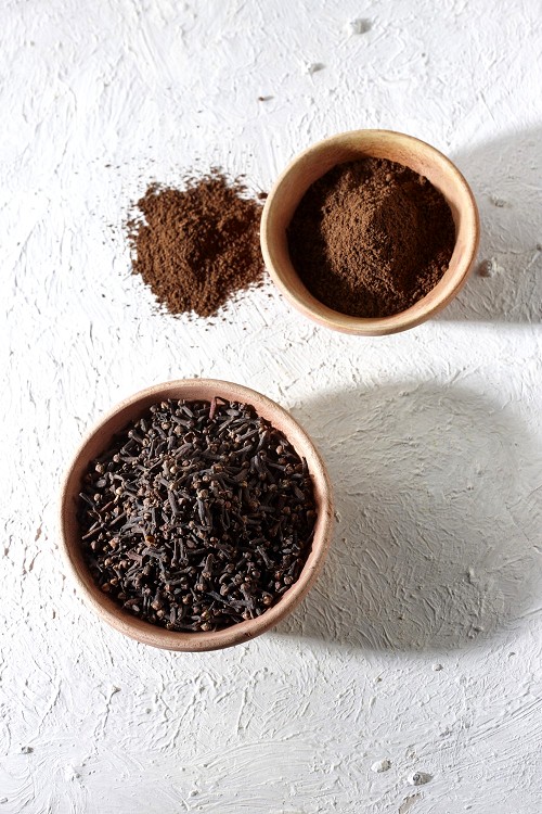 2 wooden bowls full of cloves powder and whole cloves on a textured white flooring