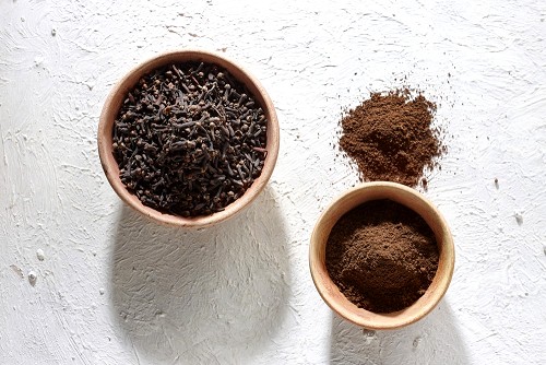 2 wooden bowls full of cloves powder and whole cloves on a textured white flooring
