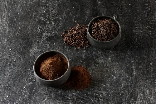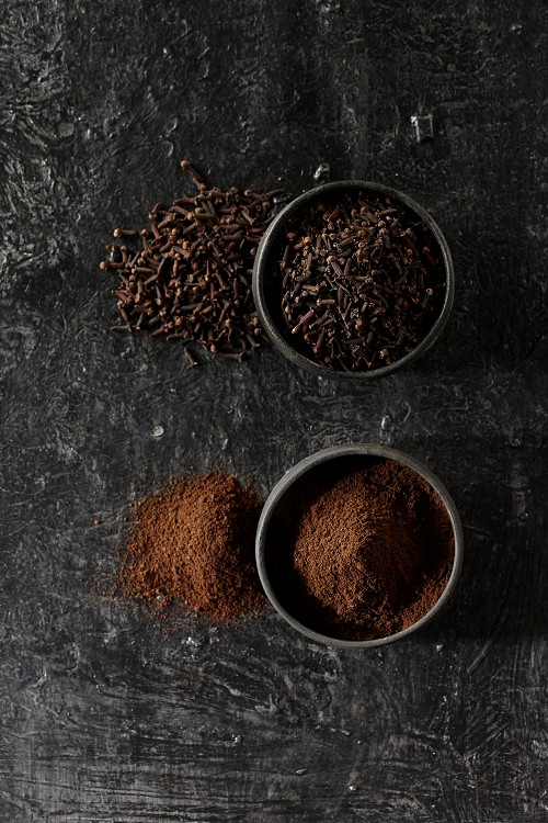 2 Black pottery bowls full of cloves and the other full of cloves powder on textured black flooring