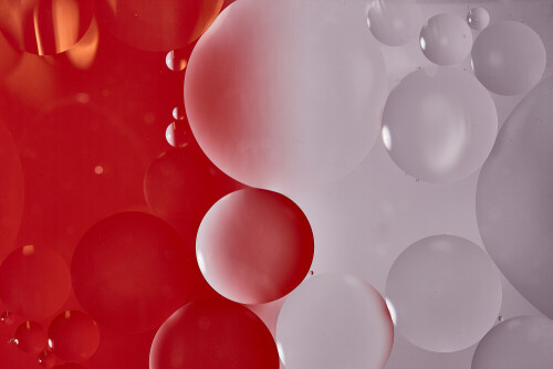 Close-ups of abstract oil bubbles on water surface in shades of white and red