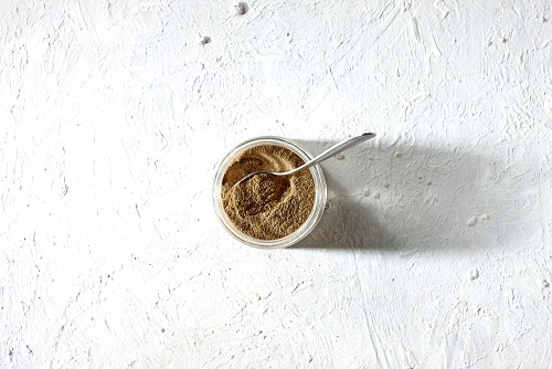 A glass jar and a metal spoon full of cumin powder on textured white flooring