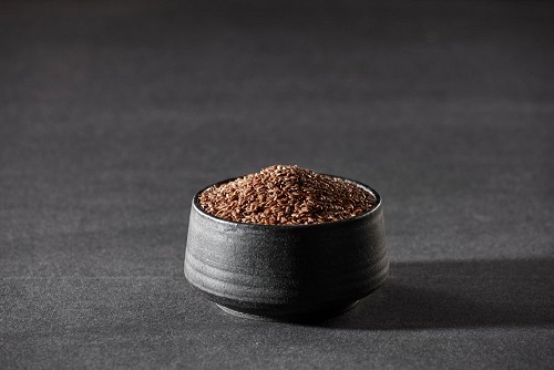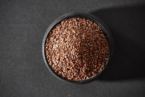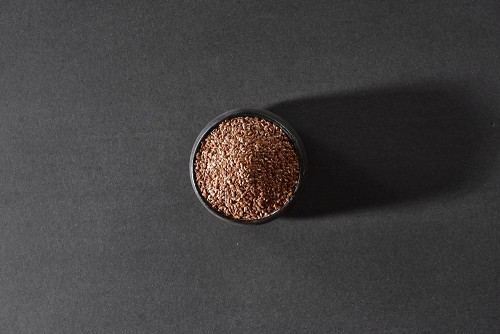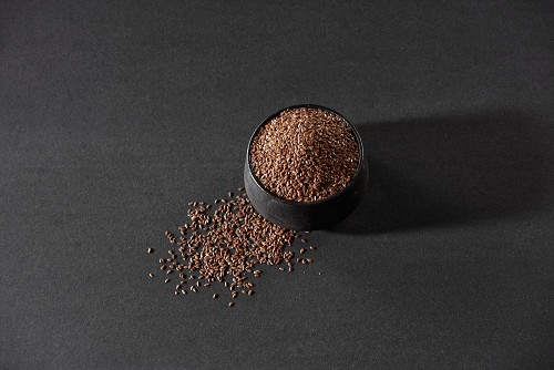 A black pottery bowl full of flaxseeds surrounded by the seeds on a black flooring