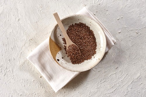 A multicolored pottery plate full of flaxseeds and wooden spoon full of seeds on a textured black flooring