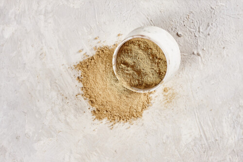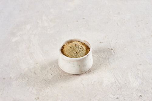 A beige pottery bowl full of ground ginger powder with fallen powder from it on white background