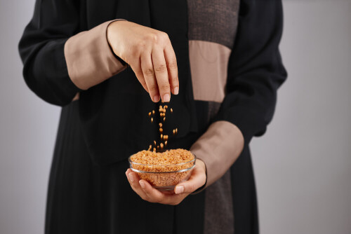Woman in abaya holding different kinds of legumes in different positions