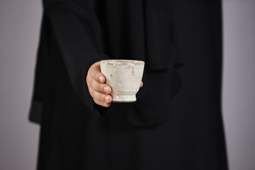 A woman in black abaya holding different pottery essentials in different positions