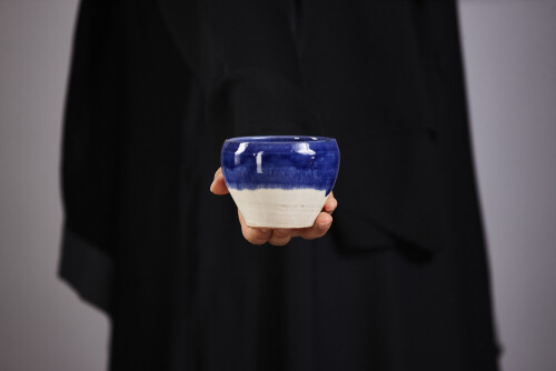 A woman in black abaya holding different pottery essentials in different positions