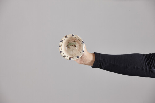 A woman in black abaya holding different pottery essentials in different positions
