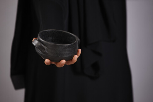 A woman in black abaya holding different pottery essentials in different positions