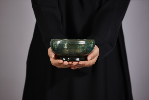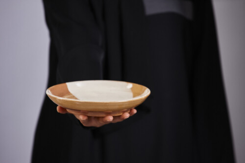 A woman in black abaya holding different pottery essentials in different positions