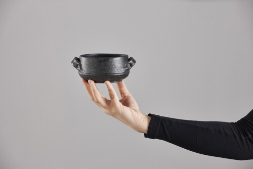 A woman in black abaya holding different pottery essentials in different positions