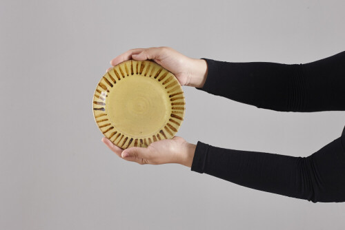 A woman in black abaya holding different pottery essentials in different positions