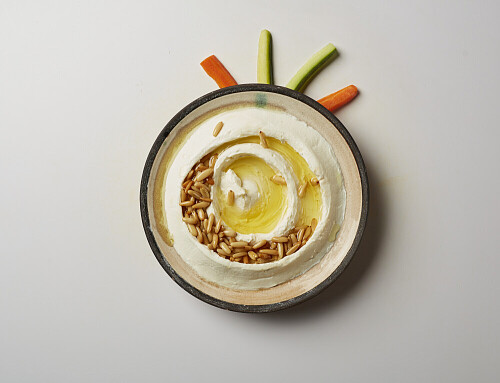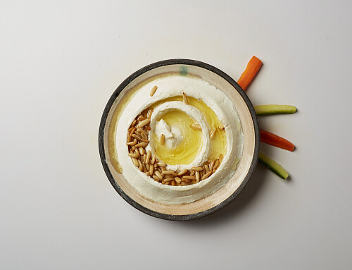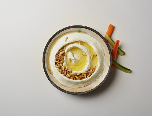 Lebnah garnished with pine nuts in a pottery plate on a white background