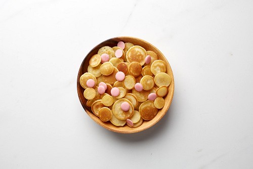 Top-view shot of mixed chocolate chips cereal pancakes in a round bowl on white background