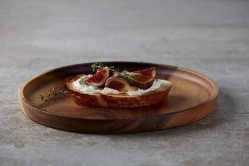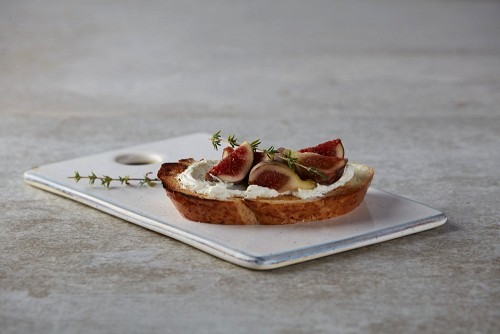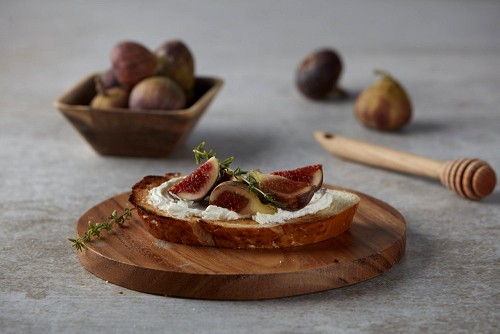 quarters of figs with cream cheese on toasted sourdough slice on a wooden board on textured grey background