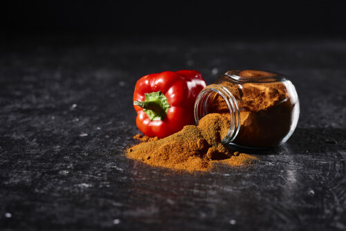 A glass jar full of ground paprika powder flipped with some spilling powder on black background