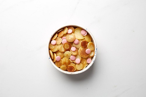 Top-view shot of pink chocolate chips cereal pancakes in a round bowl on white background