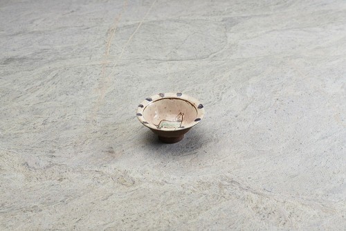 A decorative pottery plate on grey marble background