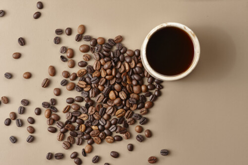A beige pottery cup of coffee surrounded by roasted coffee beans on beige background