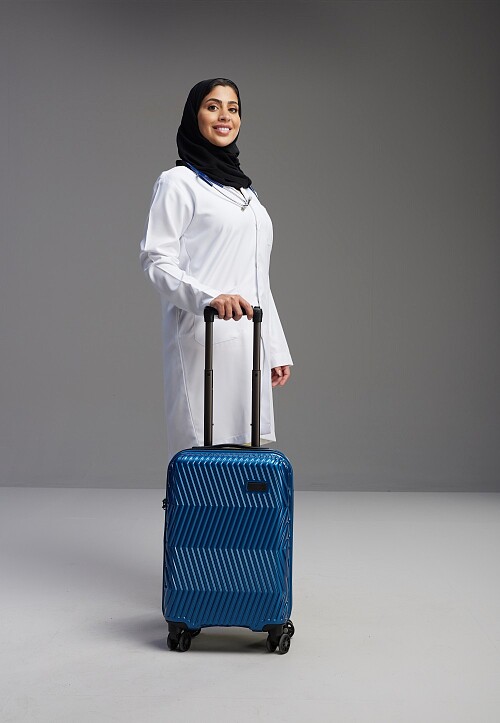 Saudi woman wearing lab coat with stethoscope standing holding Travel bag on Gray background