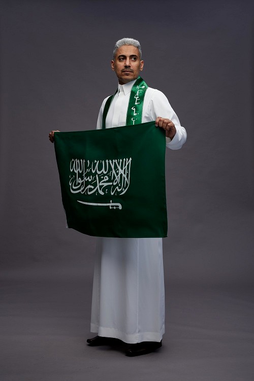 Saudi man wearing thob standing holding Saudi flag on gray background