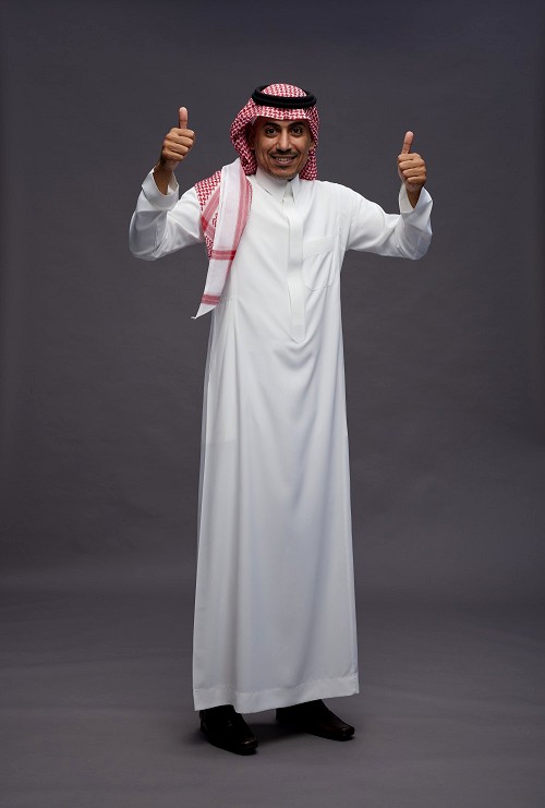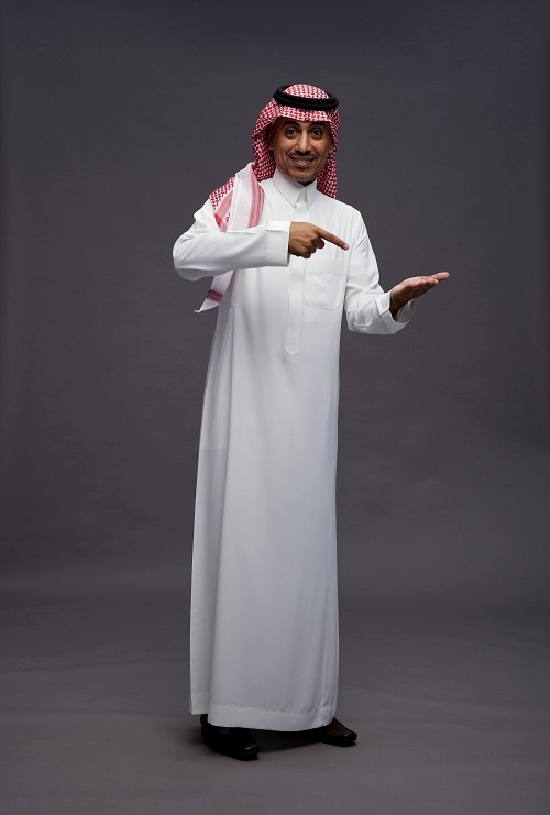 Saudi man wearing thob and shomag standing interacting with the camera on gray background