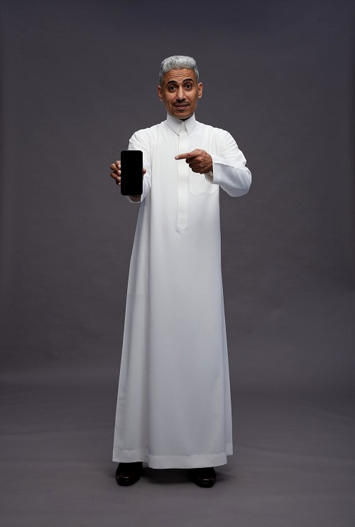 Saudi man wearing thob standing showing phone to camera on gray background