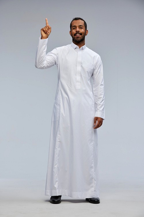 Saudi man Wearing Thob standing interacting with the camera on Gray background
