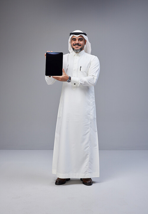 Saudi man Wearing Thob and white Shomag standing showing tablet to camera on Gray background