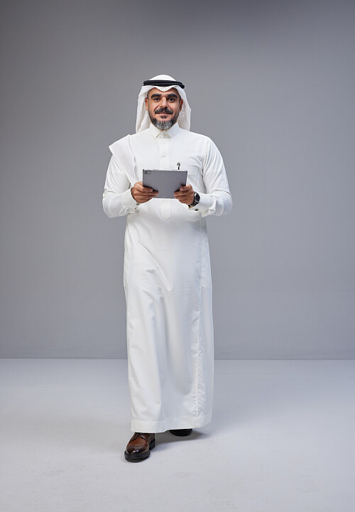 Saudi man Wearing Thob and white Shomag standing working on tablet on Gray background