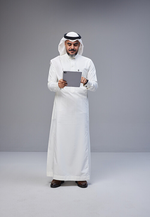 Saudi man Wearing Thob and white Shomag standing working on tablet on Gray background