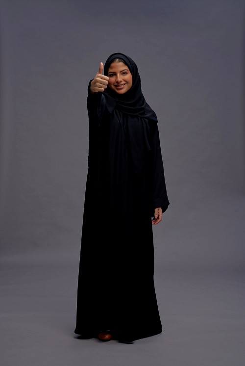 Saudi woman wearing Abaya standing interacting with the camera on gray background