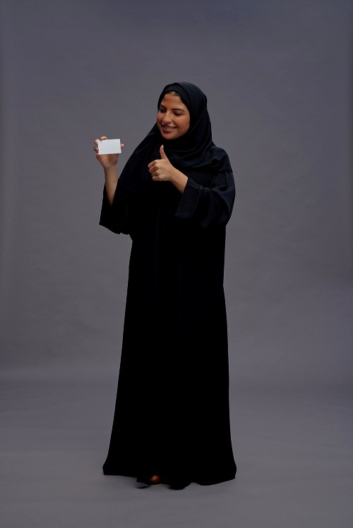 Saudi woman wearing Abaya standing holding ATM card on gray background