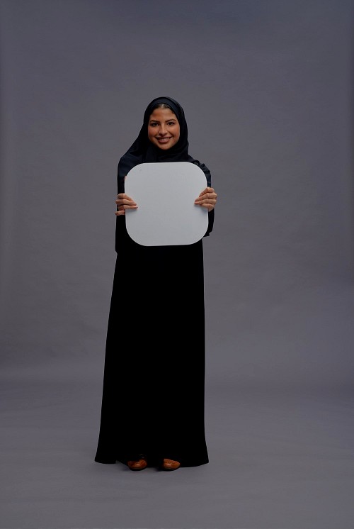 Saudi woman wearing Abaya standing holding social media sign on gray background