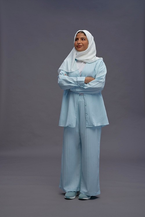 Saudi woman wearing hijab clothes standing with crossed arms on gray background