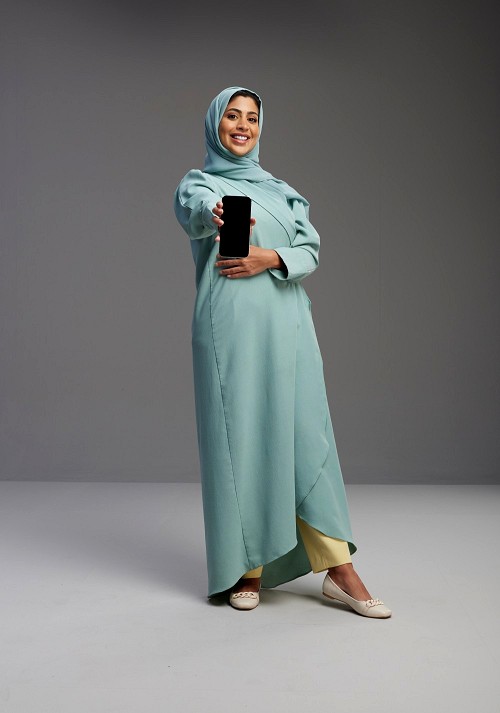 Saudi Woman wearing Abaya standing showing phone to camera on Gray background