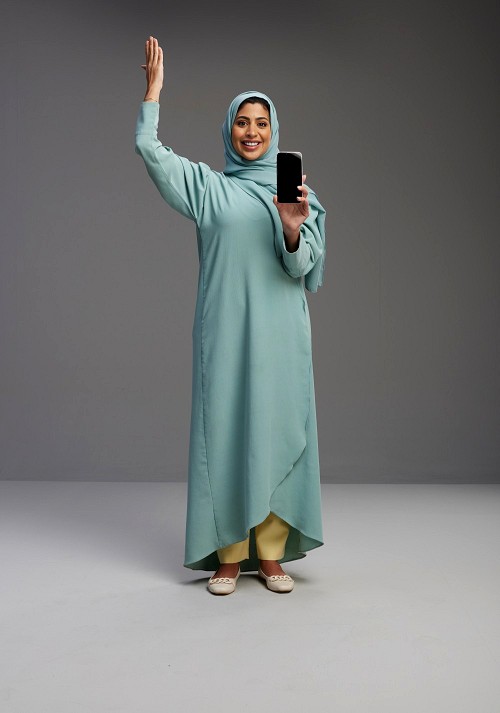 Saudi Woman wearing Abaya standing showing phone to camera on Gray background