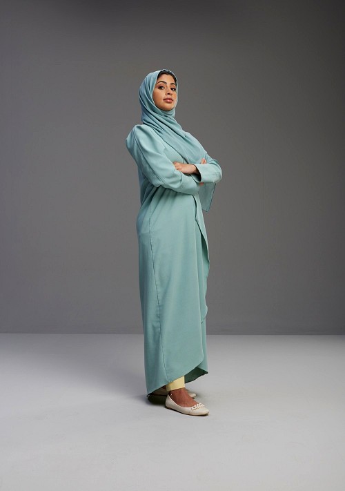 Saudi Woman wearing Abaya standing with crossed arms on Gray background