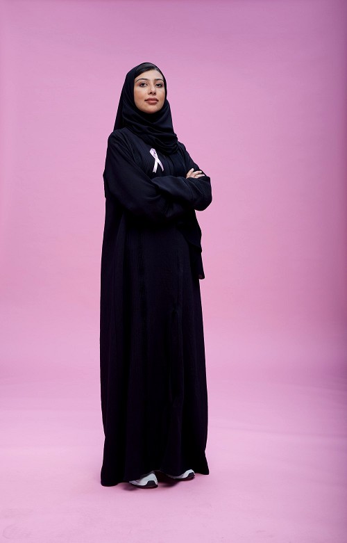 Saudi woman wearing pink ribbon on Abaya standing crossed arms on pink background
