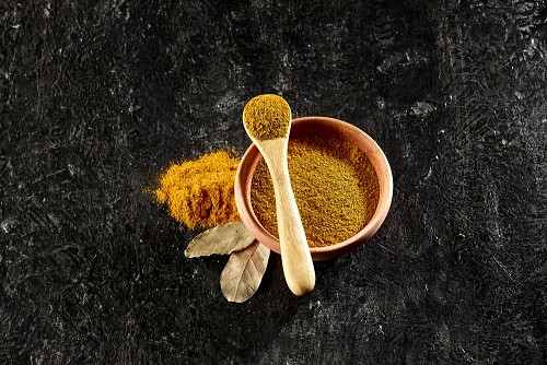 A wooden bowl and a wooden spoon full of turmeric powder on textured black flooring
