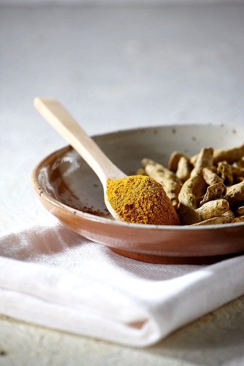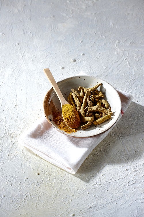 A plate filled with dried turmeric whole fingers and a wooden spoon full of turmeric powder on a textured white flooring