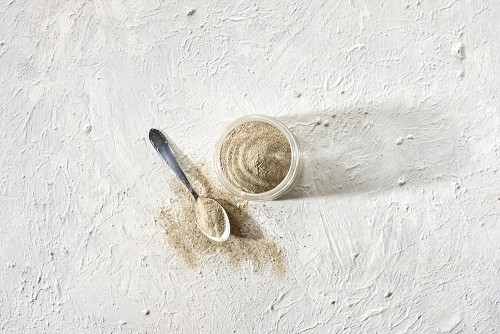 A glass jar and a metal spoon full of white pepper powder on textured white flooring