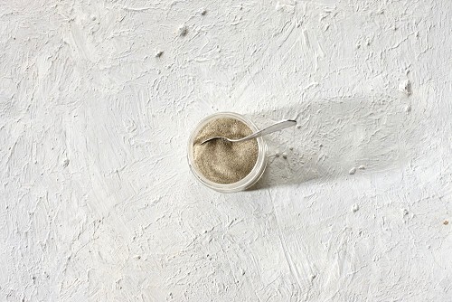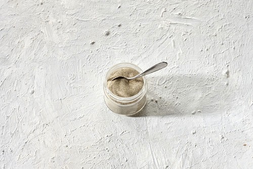 A glass jar and a metal spoon full of white pepper powder on textured white flooring