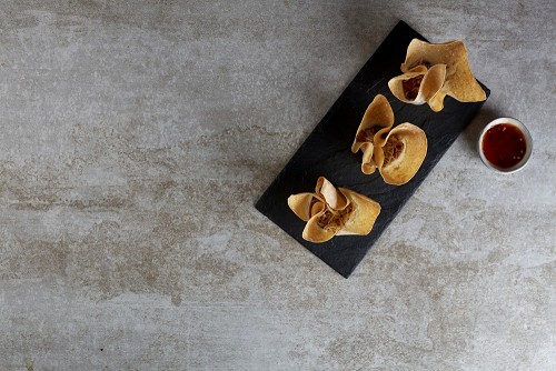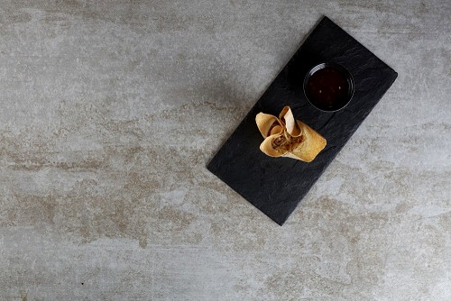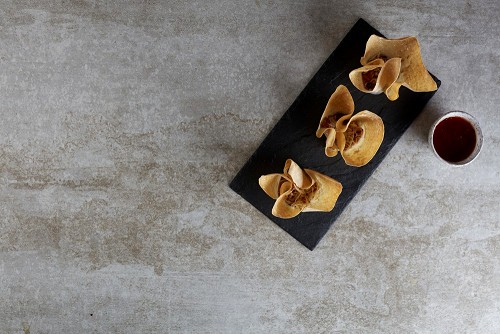 wonton cups with soy sauce ramkin on rectangle slate on grey textured counter top